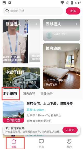 2、首頁有搜索欄,設旅游撿人等板塊,推附近向導服務,展示玩轉香港向導信息,未開定位可去開啟,底部有功能欄。