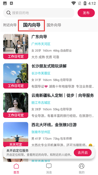 3、國內向導板塊,展示廣東向導、長沙陪玩講解等信息,標注向導年齡、職業及服務特點,方便用戶選擇國內旅游向導。