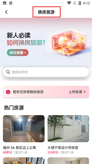 4、換房旅游板塊,有新人必讀指南,設搜索欄和上傳房源入口,展示福州5A景區公寓、大理設計師民宿等熱門房源,可換房旅游。