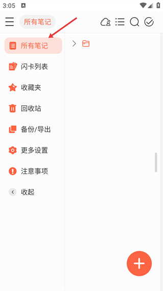 2、筆記管理頁左側欄有所有筆記、閃卡列表等分類,便于整理查找,點擊右下角加號按鈕,可快速創建新的手寫筆記。