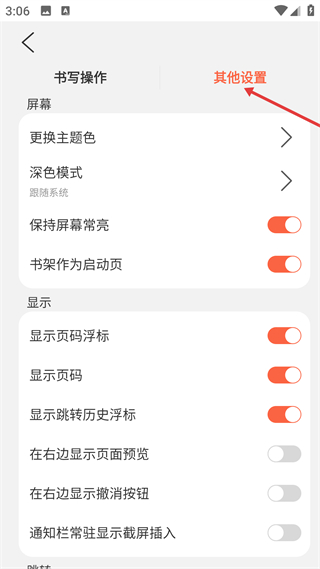 4、其他設置頁可調整主題色、深色模式,開關屏幕常亮等功能,配置頁碼顯示選項,個性化定制應用的使用體驗。