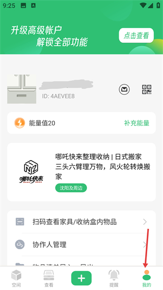 1、我的界面展示用戶ID與能量值,支持補充能量,關聯整理收納服務,提供掃碼查物品協作人管理功能。