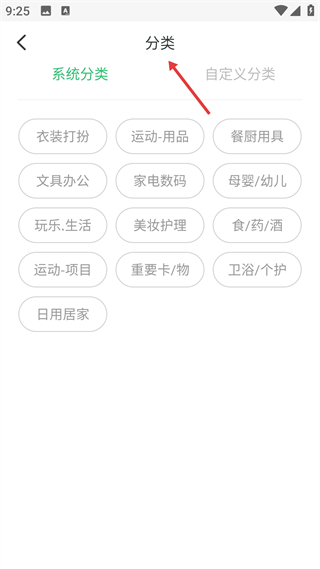 2、分類界面含系統與自定義分類,系統分類涵蓋十余類物品,助力標準化歸類,提升物品管理有序性。