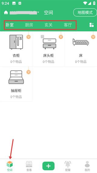 3、空間”界面以家庭場景為維度,展示對應空間家具及物品數,支持按空間管理,可切換地圖模式。