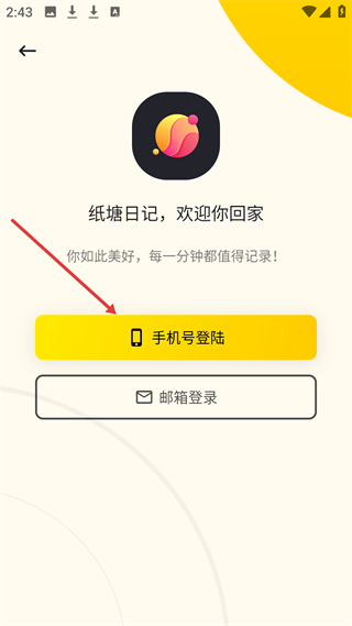 1、登錄界面,有手機號、郵箱登錄方式,展示紙塘日記,歡迎你回家歡迎語,引導用戶登錄記錄生活。