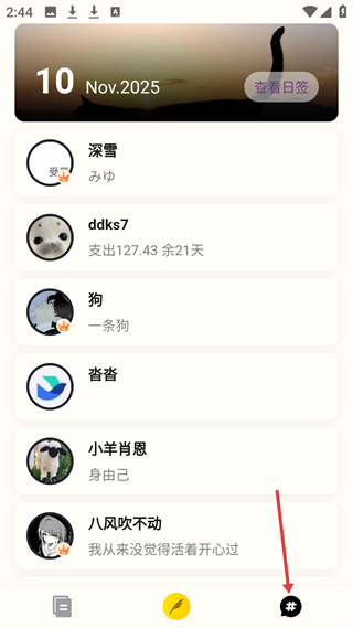 2、社交板塊,展示深雪ddks7等用戶昵稱及簽名,可查看日簽,提供用戶互動交流空間。