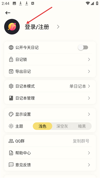 3、設置界面,有登錄注冊入口,可設置公開日記、日記鎖等,還能管理日記本模式、主題,提供個性化日記管理功能。