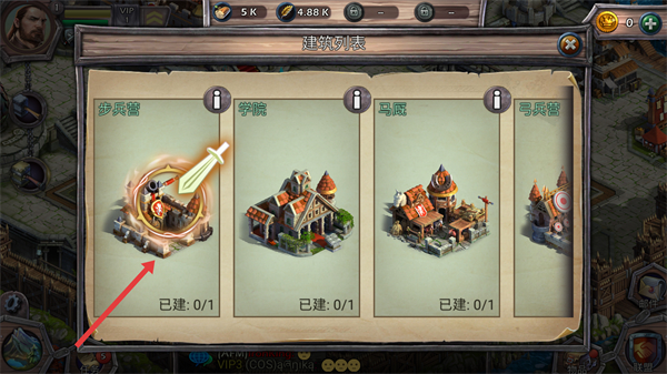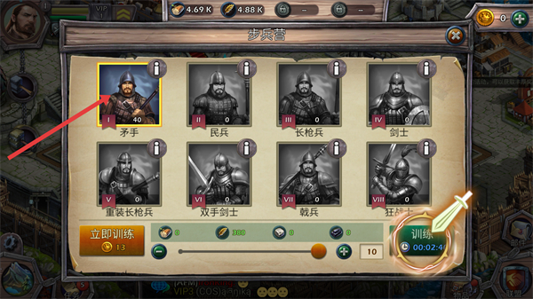 4、在步兵營可訓練矛手、民兵、長槍兵等步兵,消耗資源后提升兵力,增強城堡的戰斗實力。