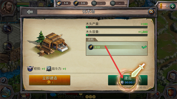 2、建造伐木場時可查看木頭產量、容量和消耗,點擊建造即可完成,提升木材資源獲取能力。