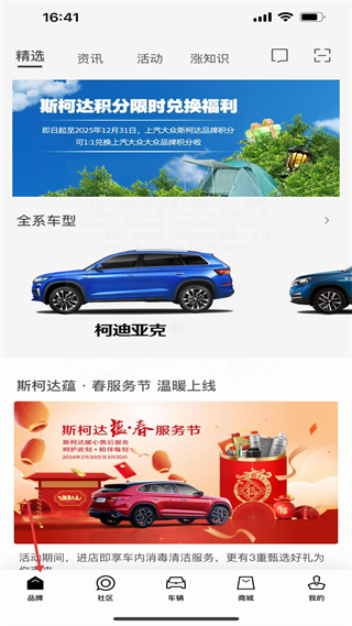 1、品牌頁展示斯柯達積分兌換、春服務節等活動,呈現柯迪亞克等車型,是品牌信息與服務活動的展示窗口,鏈接車主與品牌。
