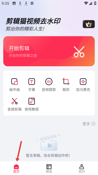 1、點擊應用首頁,有開始剪輯按鈕,還羅列畫中畫、字幕等多種剪輯功能,界面簡潔。
