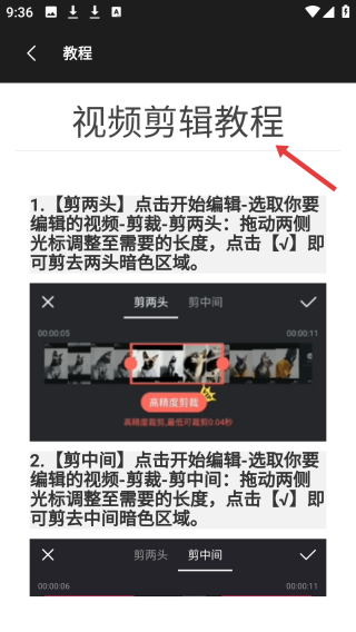 2、點擊應用內的視頻剪輯教程頁面,詳細講解剪兩頭和剪中間操作步驟,配有操作示例圖。