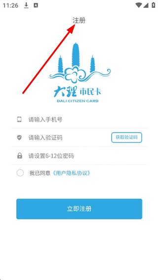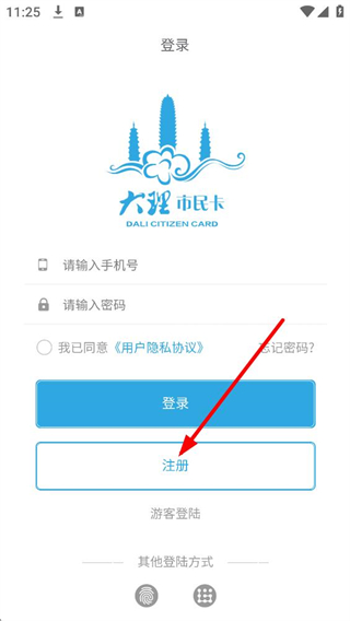 1、進入大理市民卡登錄頁面,需輸入手機號和密碼,勾選同意用戶隱私協議后點擊登錄,也可選擇注冊、游客登錄或其他登錄方式,如指紋、圖案登錄。