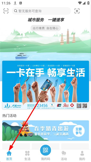 3、進入應用首頁,頂部有搜索欄,可查詢服務,頁面展示城市服務宣傳和熱門活動,底部導航欄有首頁、生活、我的碼等選項,方便用戶使用各類服務和參與活動。