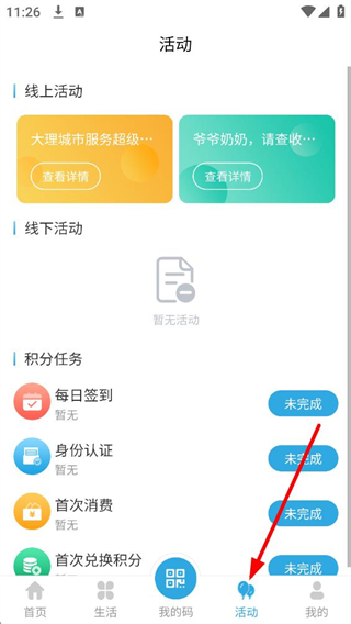 4、點擊活動進入活動頁面,可查看線上活動、線下活動和積分任務,積分任務包括每日簽到、身份認證等,可通過完成任務獲取積分,享受更多權益。