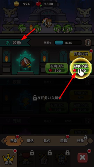 1、在裝備界面進行召喚,選擇召喚35次等次數,消耗相應資源,獲取裝備提升戰力。