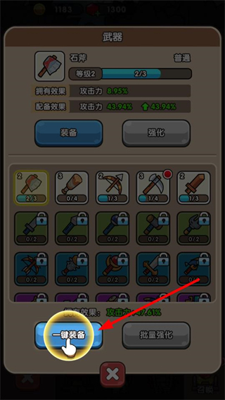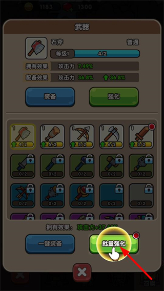 3、獲得武器后可進行批量強化,如石斧,提升其等級和攻擊力,增強武器屬性。