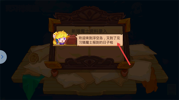 1、會有新獵魔士資料錄入提示,了解歡迎來到浮空島等信息,開啟獵魔士報到相關的冒險流程。
