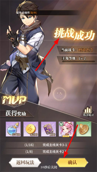 3、挑戰成功后點擊確認,領取經驗、金幣等獎勵,提升角色和魂師等級,為后續戰斗做好準備。