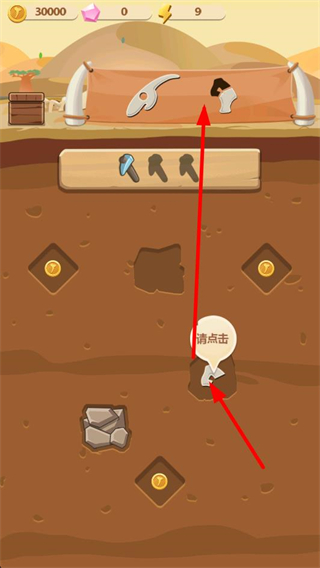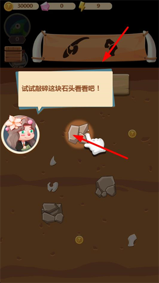 2、敲碎石頭挖掘恐龍化石碎片,收集碎片資源,提升考古的資源儲備,為化石拼接提供材料。