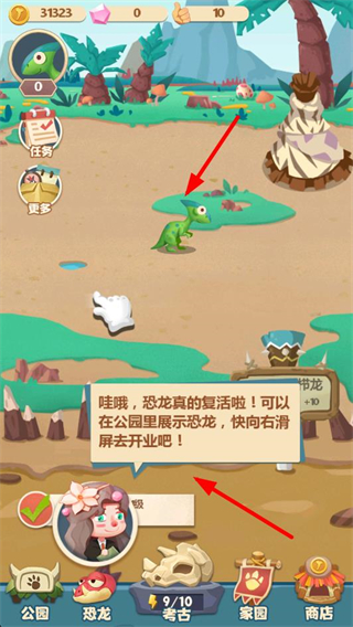 1、進入考古地點,開啟恐龍化石的挖掘之旅,為后續化石拼接和恐龍復活做好準備,推進游戲的考古進程。