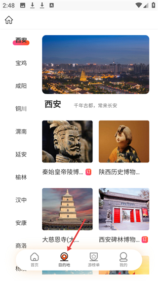 2、目的地板塊以西安為例,展示兵馬俑、大雁塔等景點,還有寶雞、咸陽等陜西多地入口,助力用戶深入了解陜西各地旅游資源。