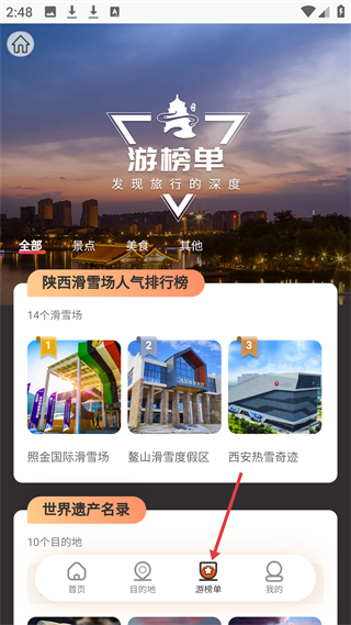 3、游榜單板塊包含滑雪場人氣榜、世界遺產名錄等板塊,分類清晰明確,幫助用戶發現陜西熱門旅游地和特色資源。