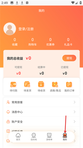 4、我的板塊可進行登錄注冊,管理收藏、訂單等,還能查看收益情況,滿足用戶旅游服務管理和個人信息管理需求。