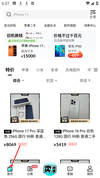 1、首頁有搜索欄可搜iPhone11,展示舊機換錢等板塊,特價區有iPhone 17Pro等二手手機,標注券后價和24H發貨。