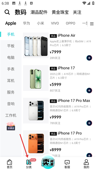 2、分類頁數碼分類有Apple等品牌,Apple手機類展iPhone Air等新品,還有平板、電腦等其他數碼分類。