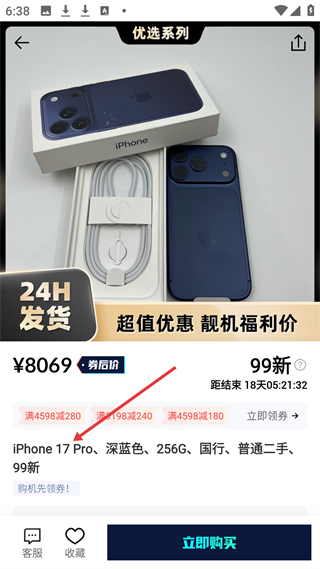 3、商品詳情頁是iPhone 17Pro,深藍色256G國行99新,券后價8069元24H發貨,有滿減券,可客服咨詢或購買。