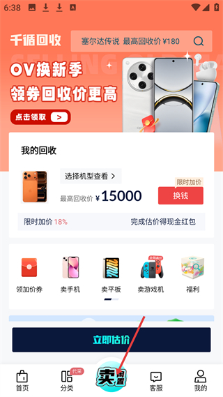 4、賣閑置頁千循回收有OV換新活動,可查機型回收價最高15000元,還有賣平板等功能,可立即估價。