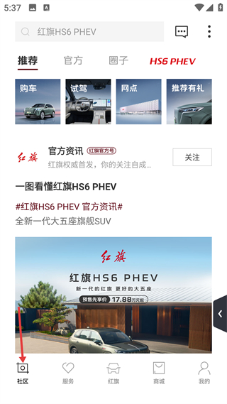 1、社區頁面聚焦紅旗HS6 PHEV,設購車等功能入口,展示官方資訊,助力用戶獲取車型信息與相關服務。
