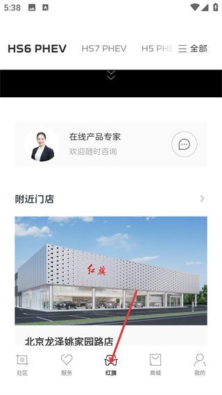3、紅旗頁面展示品牌多款車型,配備在線產品專家咨詢入口,呈現附近門店信息,便于用戶對接線下服務。