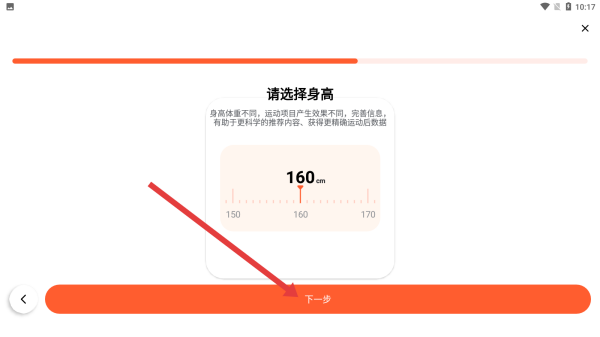 3、來到請選擇身高頁面,選好身高后,點擊下一步,繼續完善身體信息。