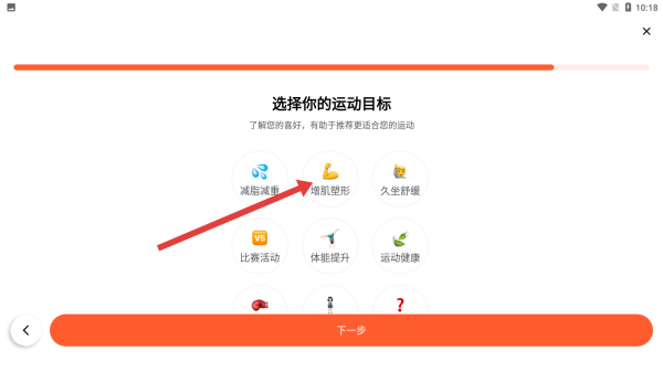 4、進入選擇你的運動目標頁面,從減脂減重、增肌塑形等目標中選擇,選好后點擊下一步,完成運動計劃定制。