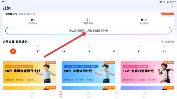 1、進入運動計劃頁面,能看到專屬運動計劃相關展示,點擊評估身體現狀,為你定制運動計劃,開啟定制流程。