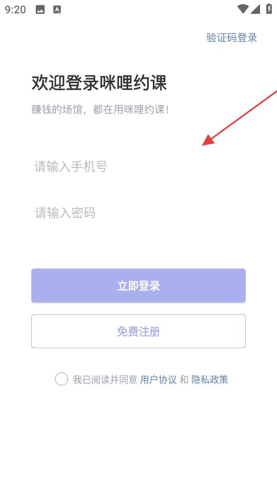 2、咪哩約課的登錄界面,有手機號和密碼輸入框,用戶填寫后可點擊立即登錄,也能選擇免費注冊。