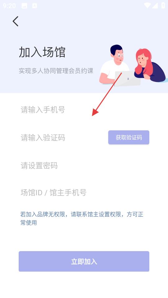 3、加入場館頁面,需輸入手機號、驗證碼,設置密碼,還得填寫場館ID或館主手機號。