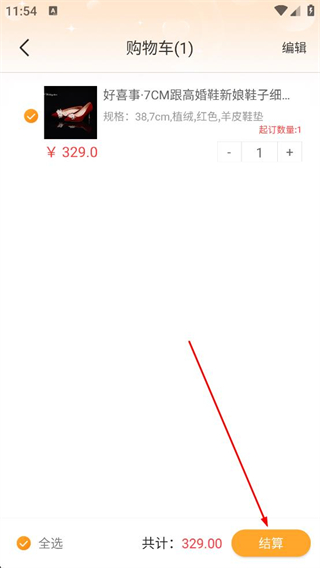 4、進入購物車頁面查看已添加的商品信息及總計金額,確認商品規格和數量無誤后,點擊結算按鈕購買商品。