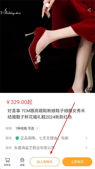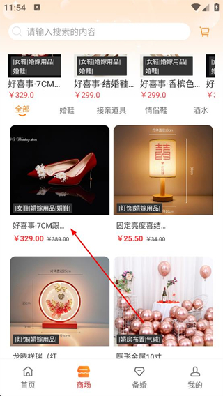 1、打開大好婚禮軟件,進入商場板塊瀏覽展示的婚慶商品,找到好事喜7CM高跟鞋對應的商品條目,點擊該條目進入商品詳情頁面。