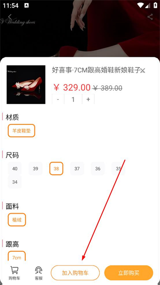 3、在屬性選擇界面選定材質尺碼面料跟高等信息,確認所選參數符合需求后,再次點擊加入購物車按鈕,將商品添加至購物車。