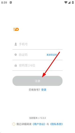 1、進入注冊界面,需填寫手機號、驗證碼、至少6位密碼,勾選閱讀用戶協議與隱私條款后點擊注冊按鈕,已有賬號可點擊登錄跳轉至登錄界面。
