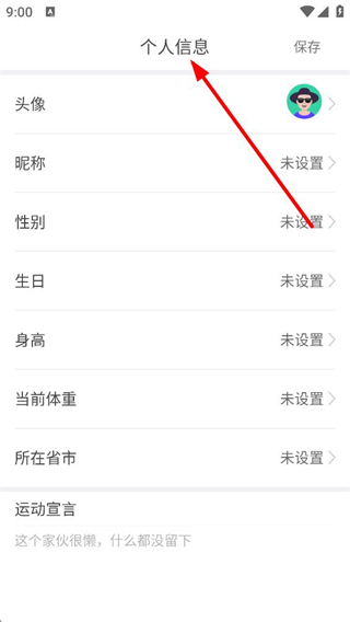 4、進入個人信息界面,可設置頭像、昵稱、性別、生日、身高、當前體重、所在省市及運動宣言,設置完成后點擊保存按鈕即可保存個人信息。