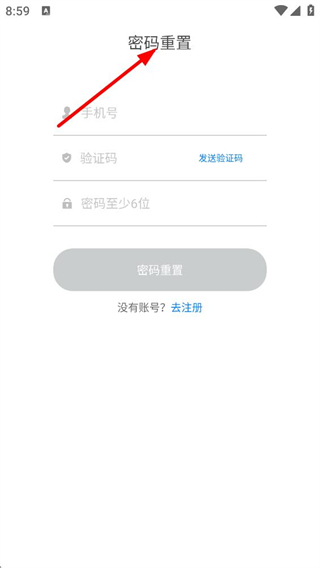 3、密碼重置界面需填寫手機號、驗證碼、至少6位新密碼,完成后點擊密碼重置按鈕,沒有賬號可點擊去注冊跳轉至注冊界面。