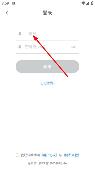2、登錄界面,輸入手機號、至少6位密碼,勾選閱讀用戶協議與隱私條款后點擊登錄按鈕,若忘記密碼可點擊忘記密碼進入密碼重置界面。