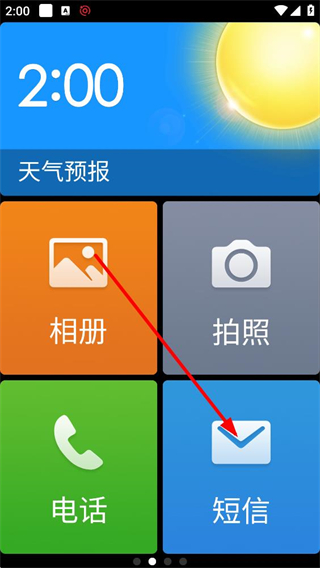 1、進入主界面,能看到時間、天氣預報板塊,還有相冊、短信等功能按鈕,點擊短信按鈕,可進入短信對應的功能頁面。