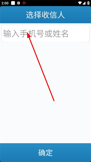 4、進入選擇收信人界面,輸入框填寫對方手機號或姓名,完成后點擊確定按鈕,即可選定短信的接收對象。