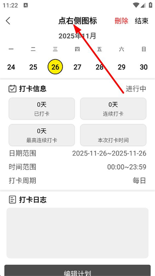 3、進入打卡項目詳情頁,可查看打卡日期、打卡信息統計已打卡天數、連續打卡等,還能對打卡計劃進行編輯、刪除或結束操作。
