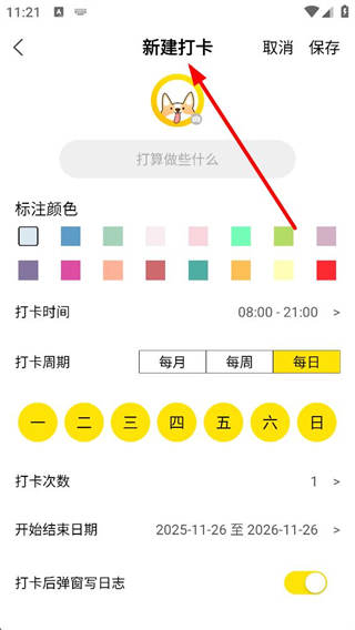 2、新建打卡界面,可輸入打卡內容、選擇標注顏色、設置打卡時間、周期、次數等信息,配置完成后點擊保存即可創建新打卡項目。